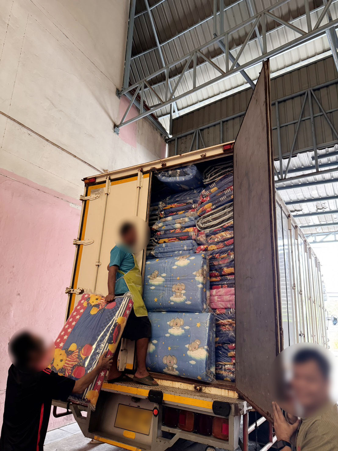 เราได้จัดส่งที่นอน 400 หลัง หมอน 300 ใบ และผ้าห่ม 2,000 ผืน